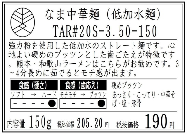 なま中華麵 TAR#20S(150g)