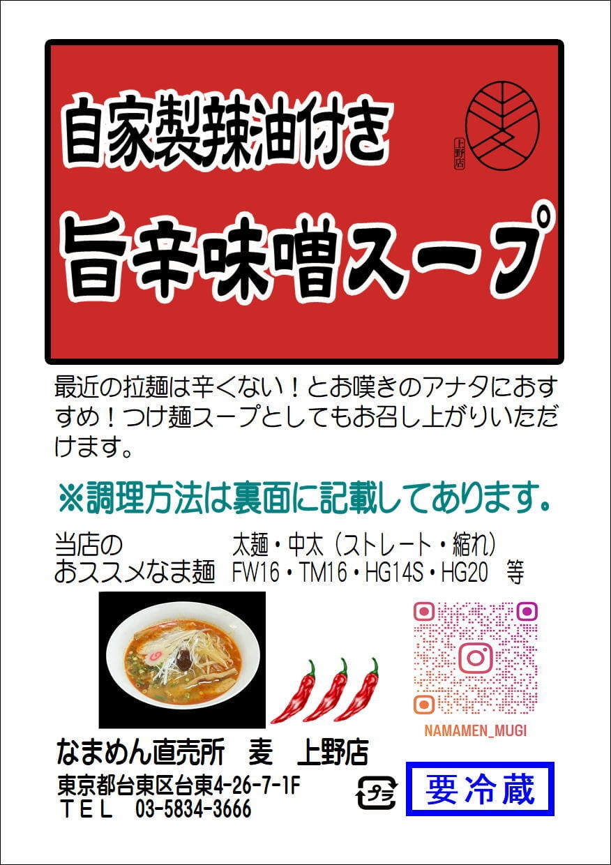 札幌風の味噌スープにたっぷりの豆板醤と唐辛子を加えた旨辛スープです。付属の自家製ラー油が辛みと旨みを演出します。辛いものが好きな方にはもってこいの一品です。