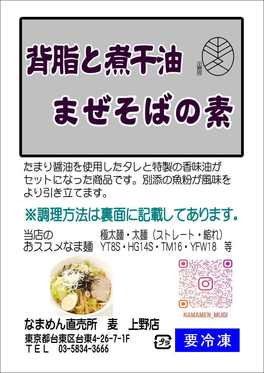 特製の醤油だれと背脂・煮干油を使用した『こってり系』のまぜそばのたれセットです。別売りの魚粉をトッピングするとさらに美味しくお召し上がりいただけます。