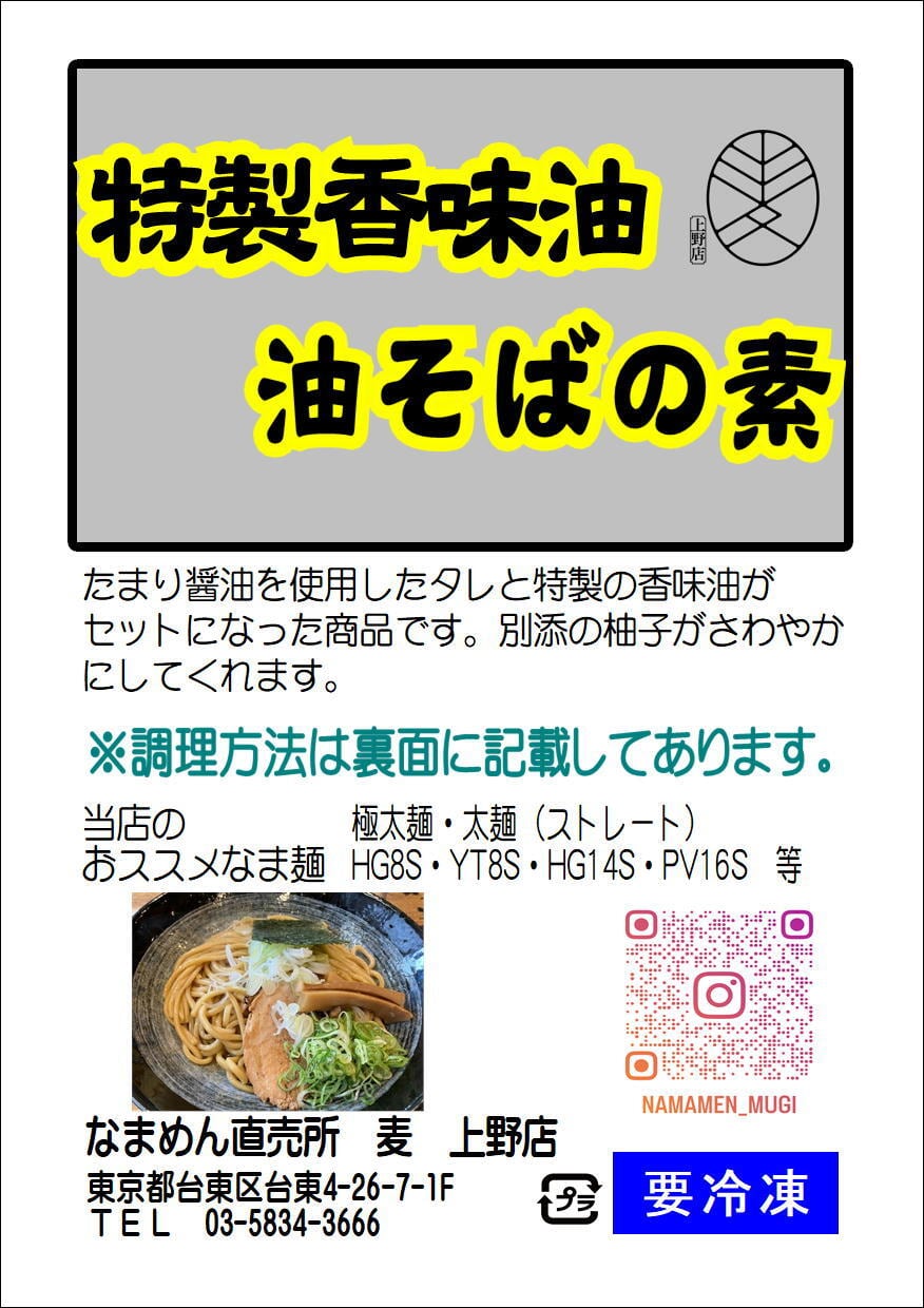 たまり醤油を使用したタレと鶏油・にんにく・エビ油でコクがあり香り高い特製の香味油をセットにした商品です。お好きなトッピングでオリジナルの油そばをお楽しみください。
